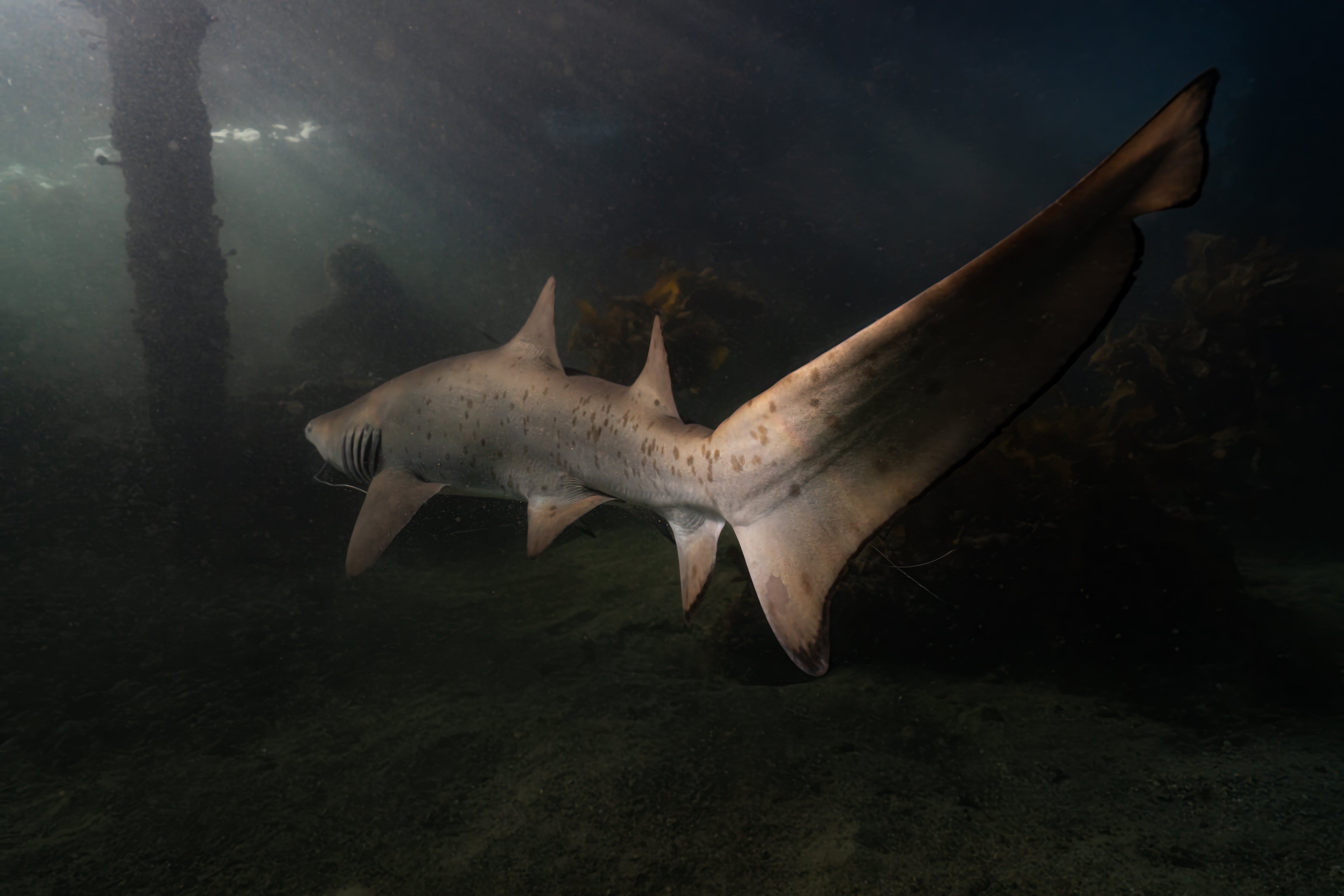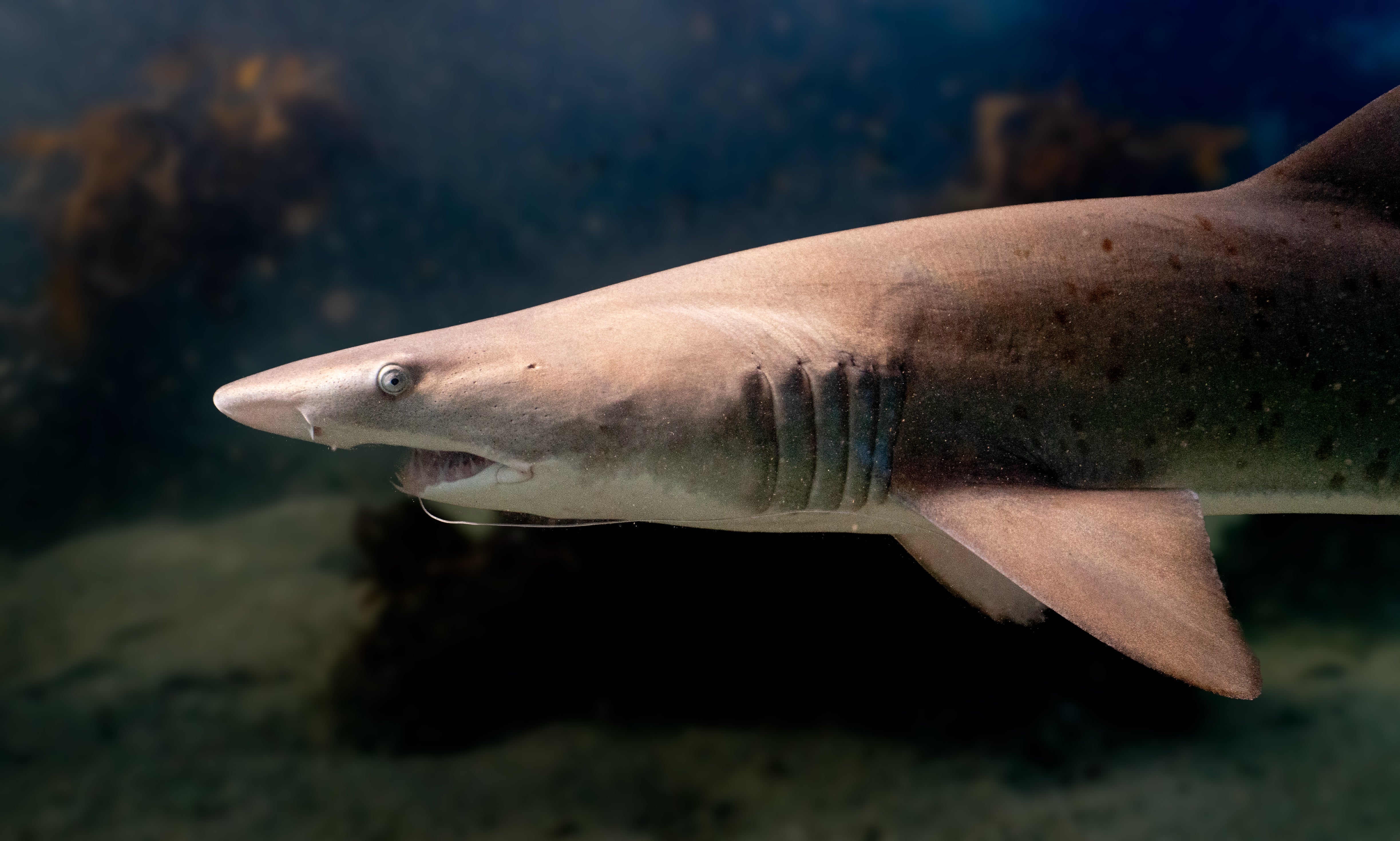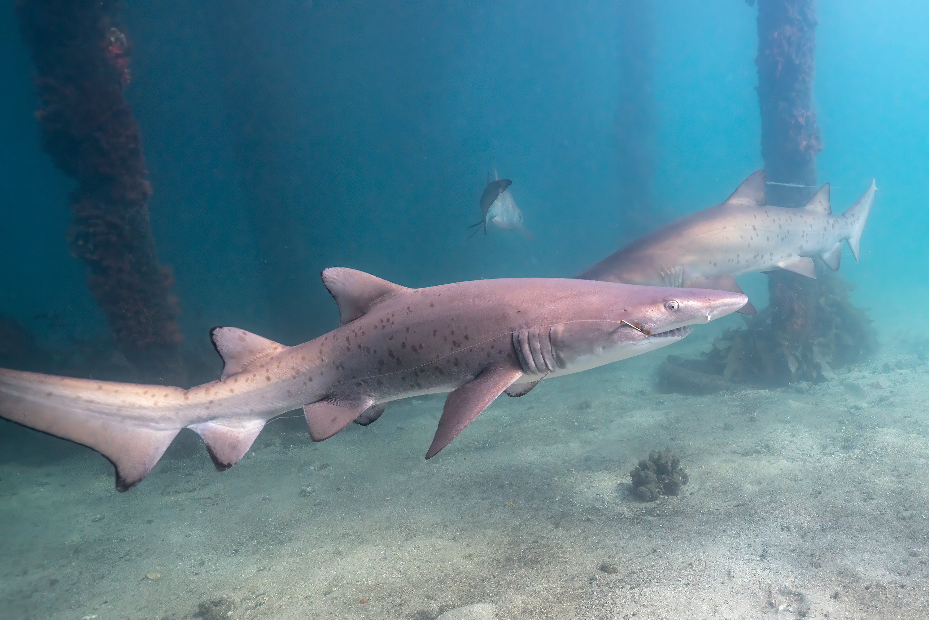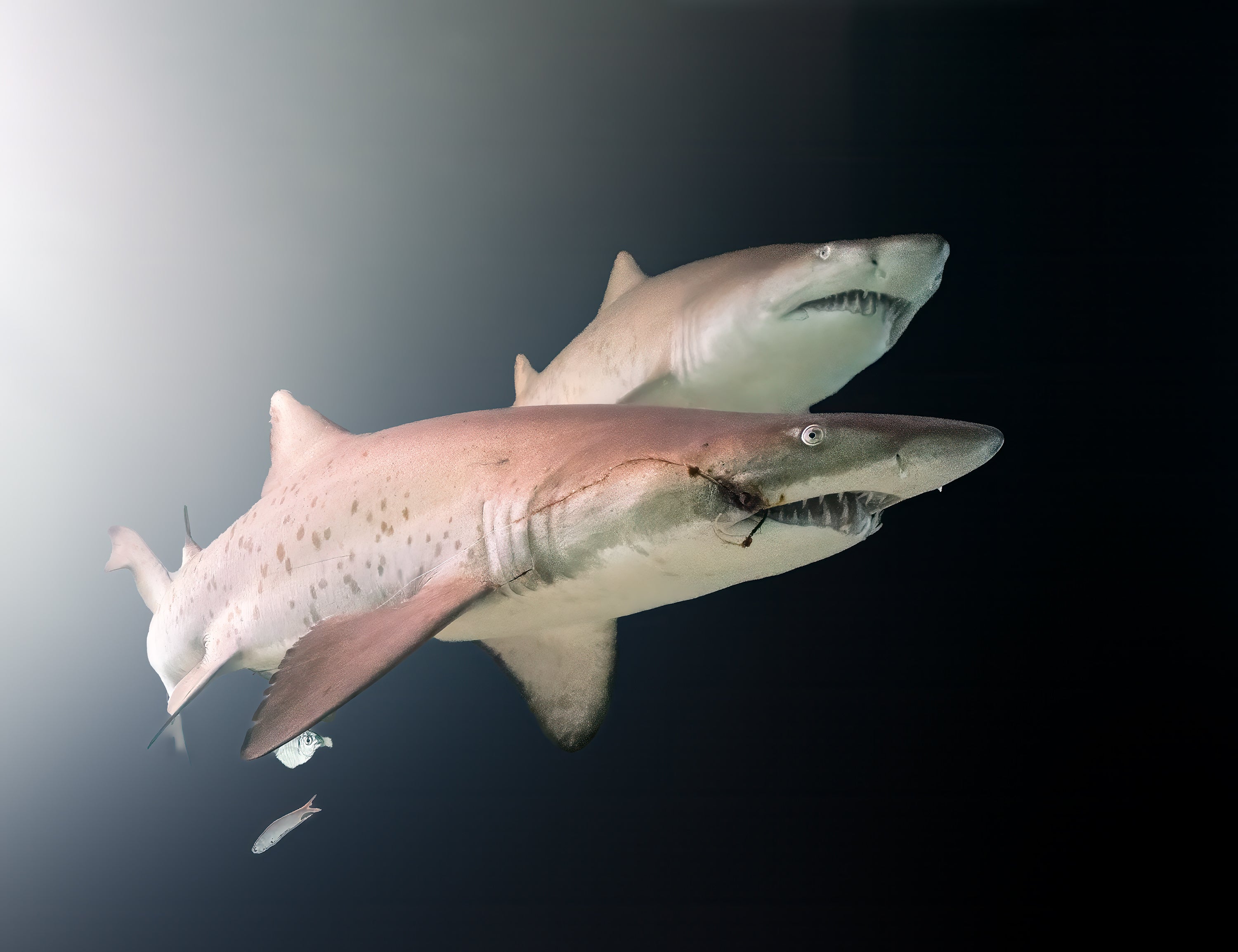 These images document critically endangered grey nurse sharks injured by discarded fishing gear, highlighting the ongoing impact of human activity on protected marine species.