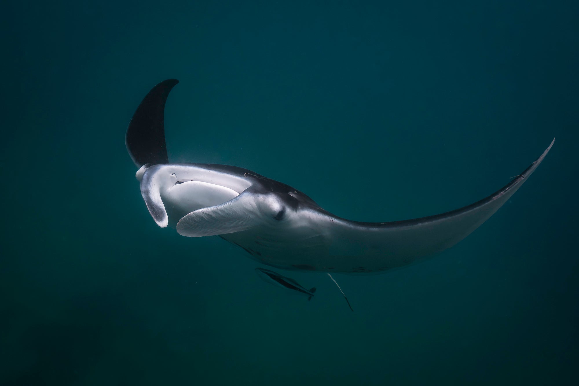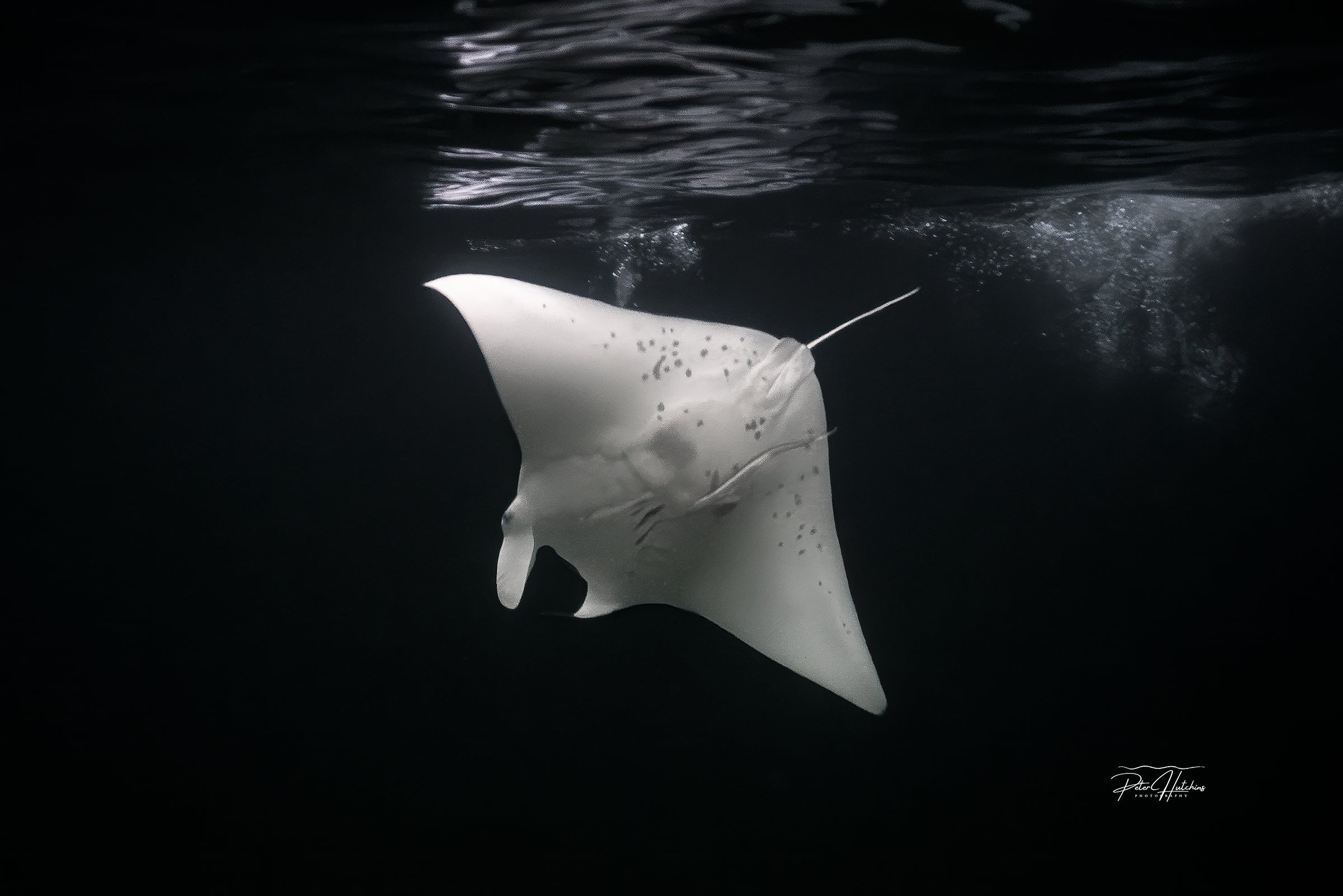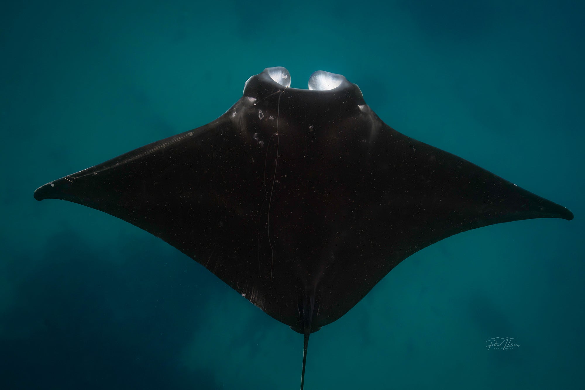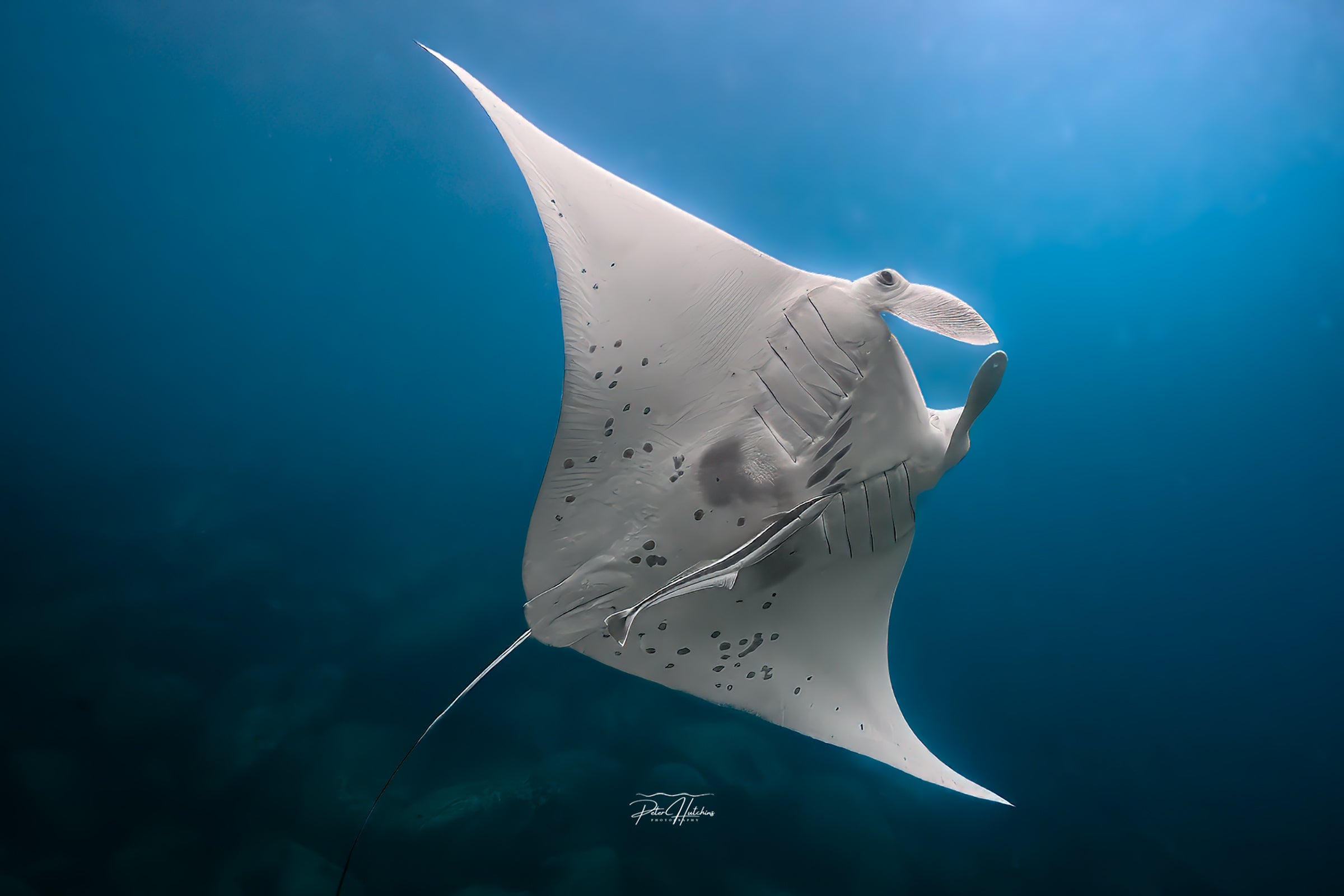 A manta ray photographed off the Manly coastline with two fishing hooks visible near the mouth. The image records the presence of marine debris impacting large pelagic species in near-shore environments.